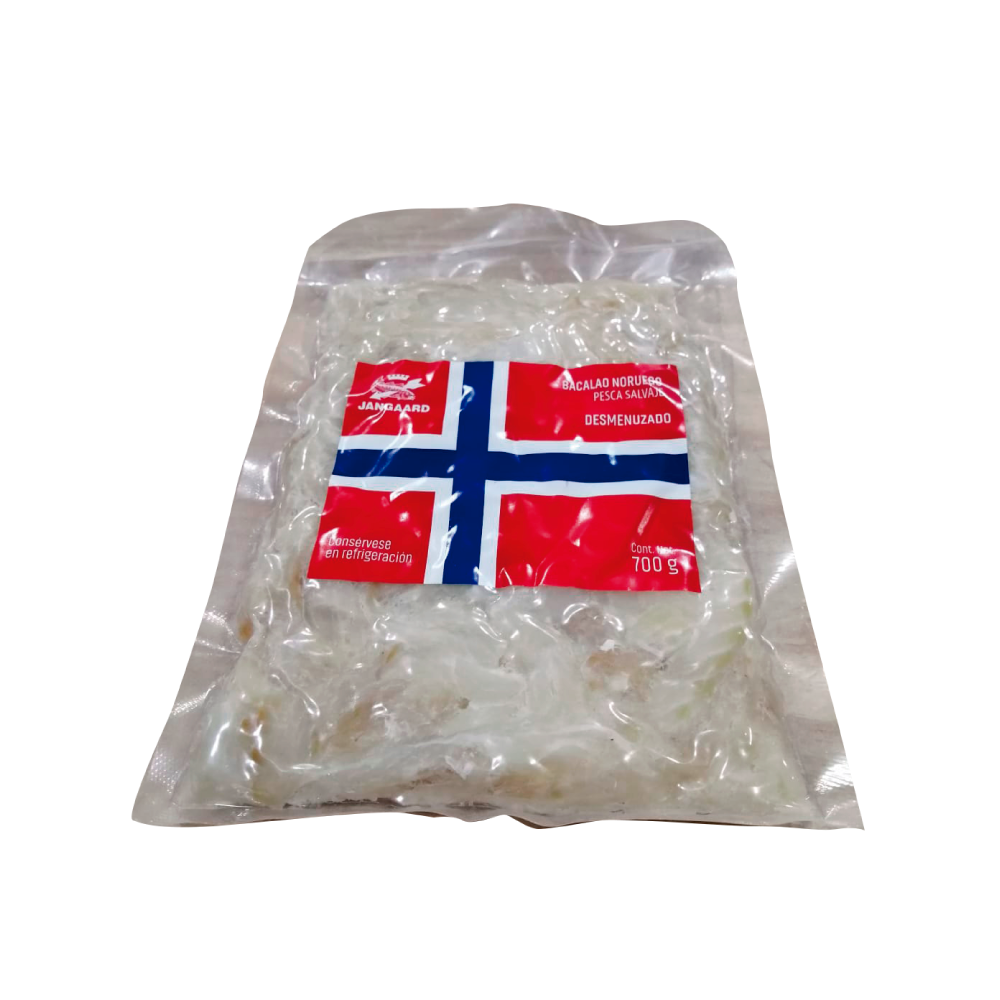 700 g de auténtico bacalao noruego desmenuzado extra empacado al vacío calidad premium.